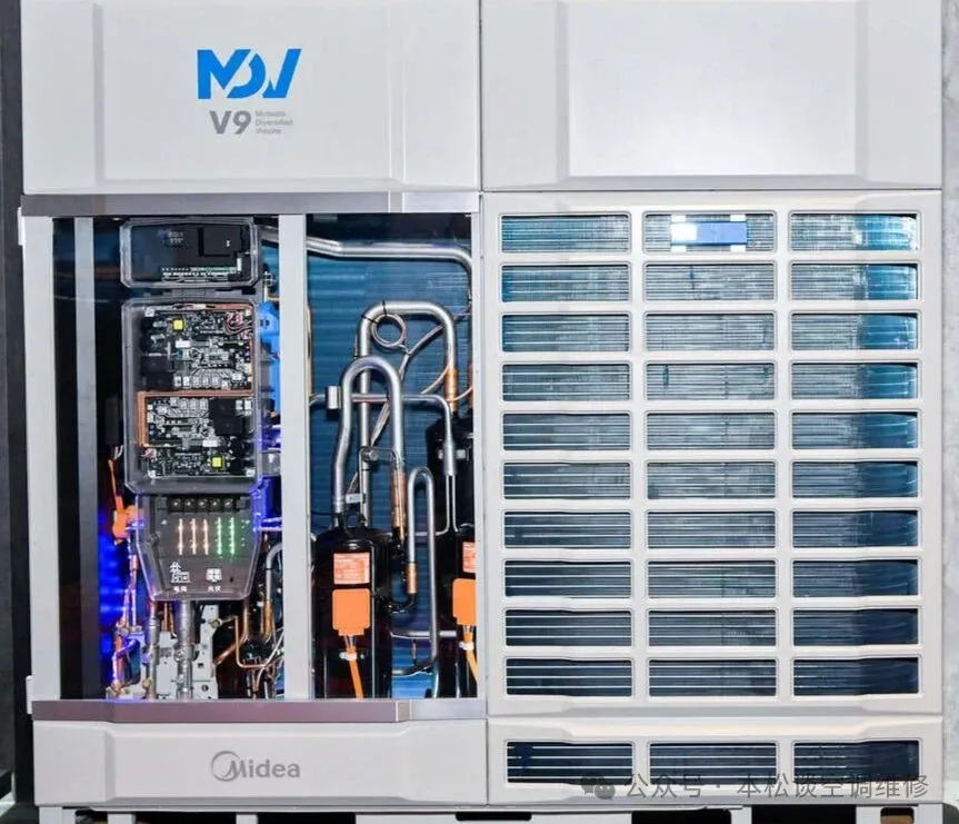 另一边是材料替代彻底常态化。以美的V9多联机为例,走近外机就能清晰看到:压缩机回气管、高压管、补气增焓管,全部用不锈钢管道替代传统铜管,连四通阀、截止阀也换成不锈钢材质,降本增效落到实处。