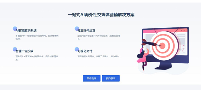 AI驱动的全链路营销服务:整合智能获客、转化优化、客户管理等功能,提供从流量获取到订单转化的一站式解决方案。大数据分析与精准营销:通过数据分析洞察市场趋势,制定个性化营销策略,提升投放效率与ROI。