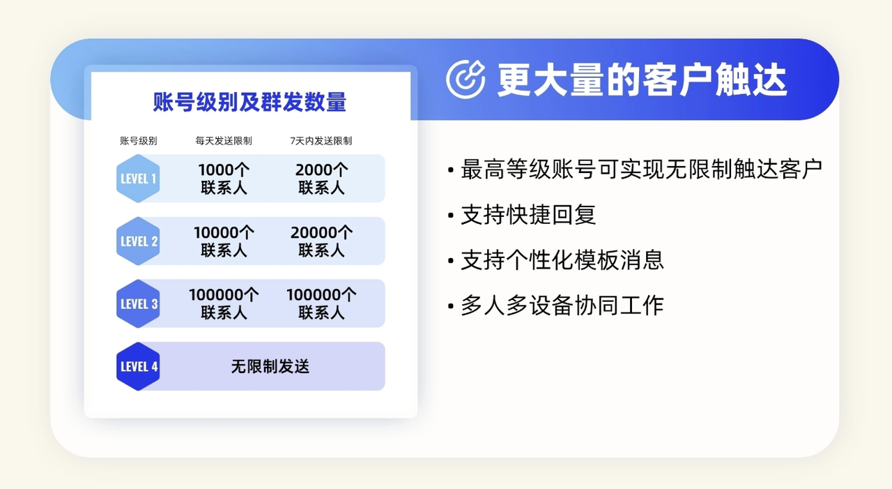 AI大模型技术底座,私有化部署能力:以全球大模型为技术核心,支持企业私有化模型部署,结合专属知识图谱,让AI智能体深度适配企业业务流、数据流及多样化出海场景,精准响应需求。多平台支持:与 Google、Facebook、TikTok、LinkedIn 等全球主流平台官方 API 对接,具备高权限数据接入与精细化运营能力,保障营销合规性与投放效率。
