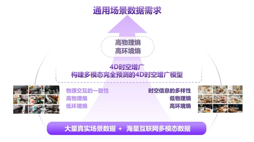 通用具身智能要实现跨场景泛化,其训练数据必须具备“高物理熵”与“高环境熵”两大特征。以通用家庭场景为例,机器人需完成多物体泛化操作、适配复杂背景与动态干扰,其能力核心可拆解为两类指标:环境熵指场景布局、光照、场景任务规划等语义环境的复杂度;物理熵对应刚体、柔性体等不同属性物体动静态交互的物理规律复杂度。而目前环境熵适配已具备基础(如seedance等视频生成模型),对于具身通用来说还需要主攻物理熵,打透底层物理交互一致性。