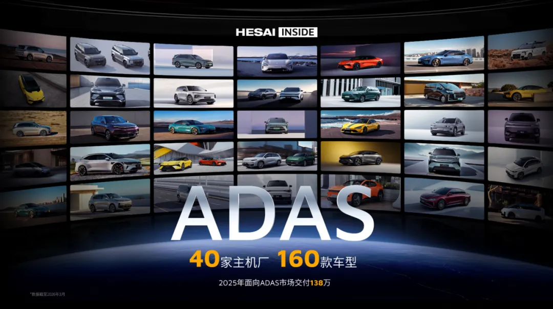 市场地位的稳固,源于头部车企的认可。禾赛深度赋能理想、小米、零跑、比亚迪、极氪、长城等品牌热销车型。其中,小米 YU7 和近期上市的新 SU7 全系标配禾赛激光雷达,上市即爆款。截至目前,禾赛已获 40 家汽车品牌超过 160 款车型的量产定点,覆盖中国销量前十的全部汽车品牌,并已斩获前两大 ADAS 客户 2026 年全系车型定点合作。这不仅体现了禾赛在全栈自研芯片化技术、高可靠产品性能及规模化量产能力上的综合领先优势,更标志着禾赛的技术实力与产品竞争力已获头部车企集体认可,成为智能汽车的标配之选。