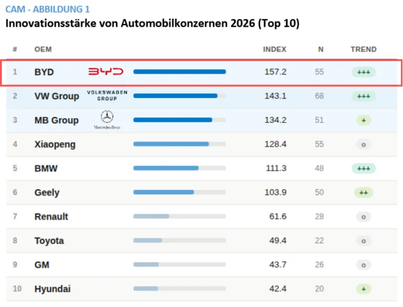 德国汽车管理中心CAM自2005年启动“汽车创新研究”榜单,比亚迪此次登顶,成为该榜单创立以来首家拿下全球冠军的中国企业。