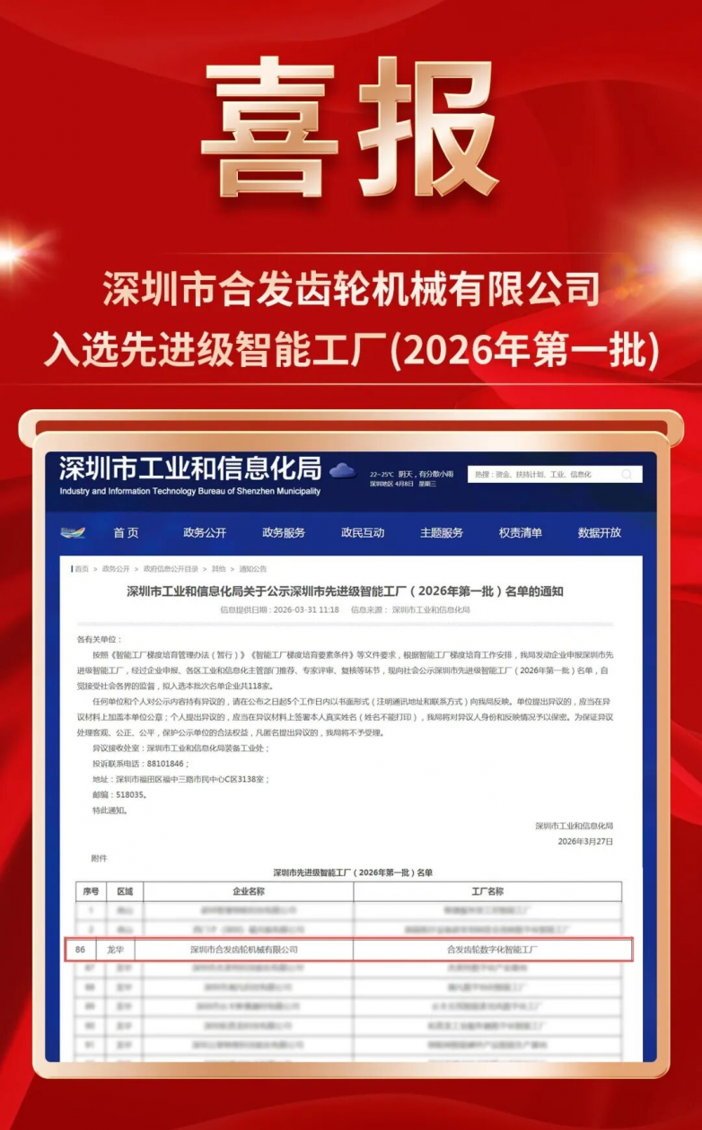 近日,深圳市工业和信息化局正式发布《关于公示深圳市先进级智能工厂(2026 年第一批)名单的通知》,深圳市合发齿轮机械有限公司(以下简称合发齿轮),凭借在数字化转型、智能化制造、精密化生产领域的卓越实践与突出成果,成功通过认定,跻身深圳市首批先进级智能工厂行列。这一权威荣誉,是对合发齿轮27年深耕精密传动制造、持续推进智能制造升级的高度肯定,更标志着公司在高端装备制造领域的智能化水平迈入行业新高度。