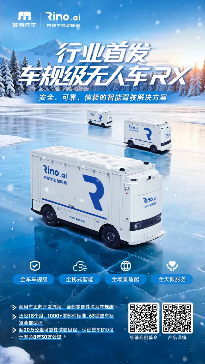 2026年4月9日,中国L4级自动驾驶商业化迎来关键里程碑。白犀牛自动驾驶与国内新能源商用车制造商鑫源汽车联合宣布成立合资公司,共建全球首家专注Robovan的主机厂。同时,双方联合研发的行业首款全车规级无人车——白犀牛RX正式首发。