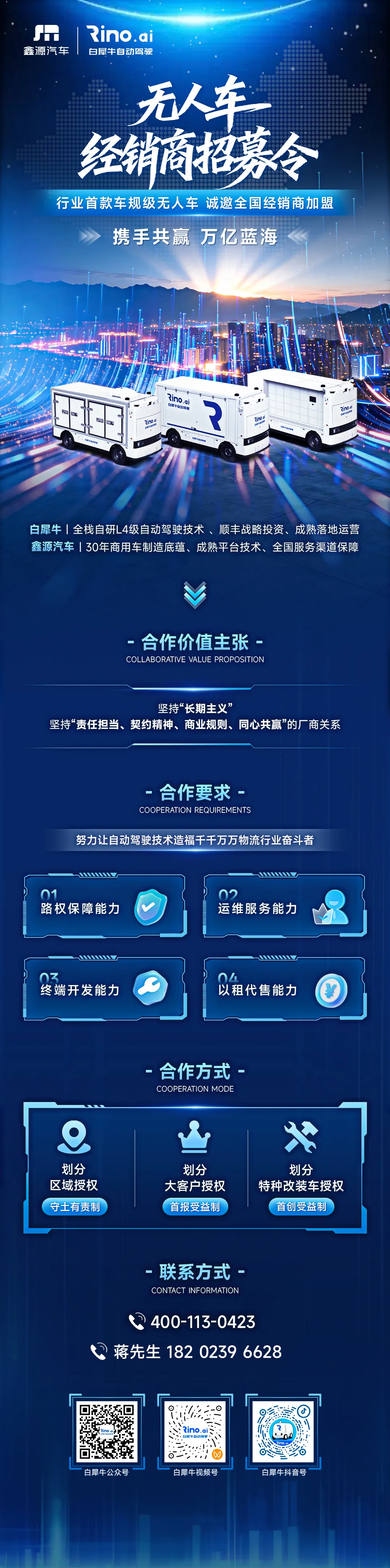 随着白犀牛RX规模化量产落地,无人商用车正加速迈入"规模化盈利"阶段。为进一步拓展同城货运市场、共建智能物流生态,白犀牛现已正式启动全国渠道合作伙伴招募,诚邀物流、运营、渠道等领域伙伴携手合作,共享自动驾驶产业红利,共筑城市智慧物流新未来。