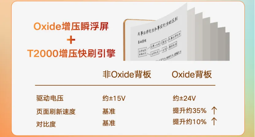 Clear7锦鲤在屏幕底层结构中引入Oxide氧化物背板技术。相较传统非晶硅背板,Oxide背板具备更强驱动能力,驱动电压提升至约±24V,可进一步加快墨水粒子运动速度,带来更迅速的像素响应与更干净的页面刷新效果。配合T2000增压快刷引擎,Clear7锦鲤在翻页、滑动、切换等高频操作中更加流畅顺滑,阅读连贯性进一步提升。与此同时,产品画面对比度也得到优化,文字边缘更加清晰,整体显示观感更加通透,为用户带来更接近纸书的舒适阅读感受。
