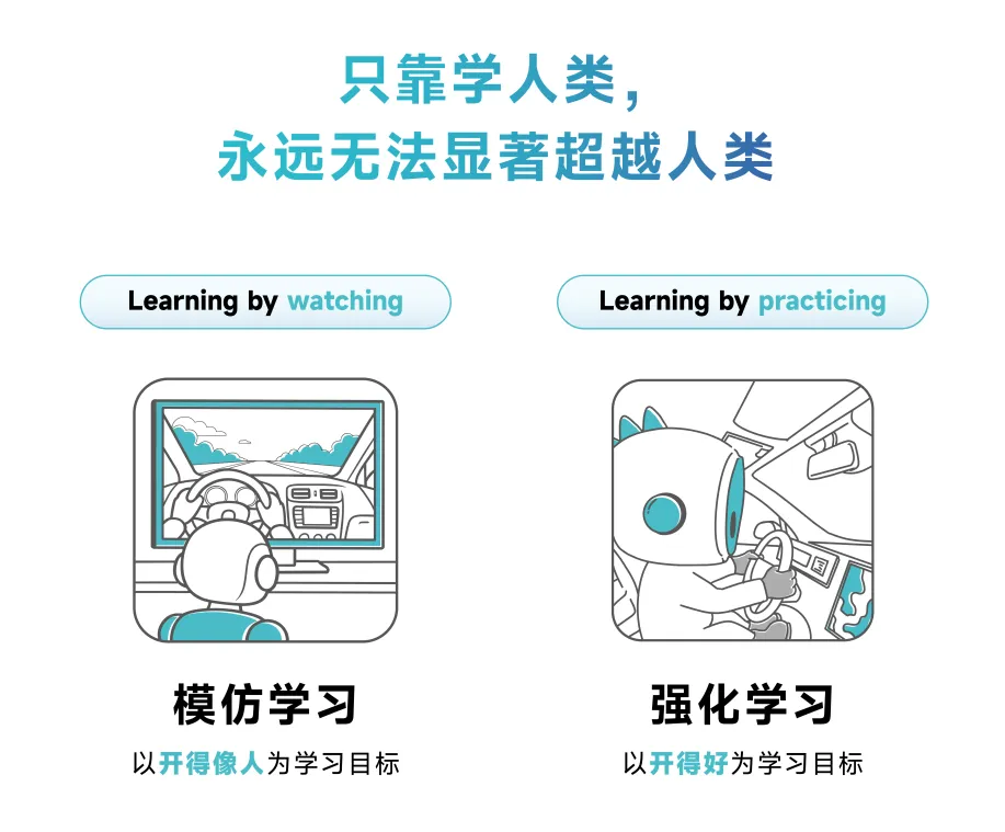 而一旦模型的学习目标从“像人开得一样”变成“开得好”,这意味着一种范式的变化——从模仿学习到强化学习。AlphaGo在棋盘上自我对弈实现强化学习,以“获胜”为学习目标增强棋艺,而非“下得像人”。