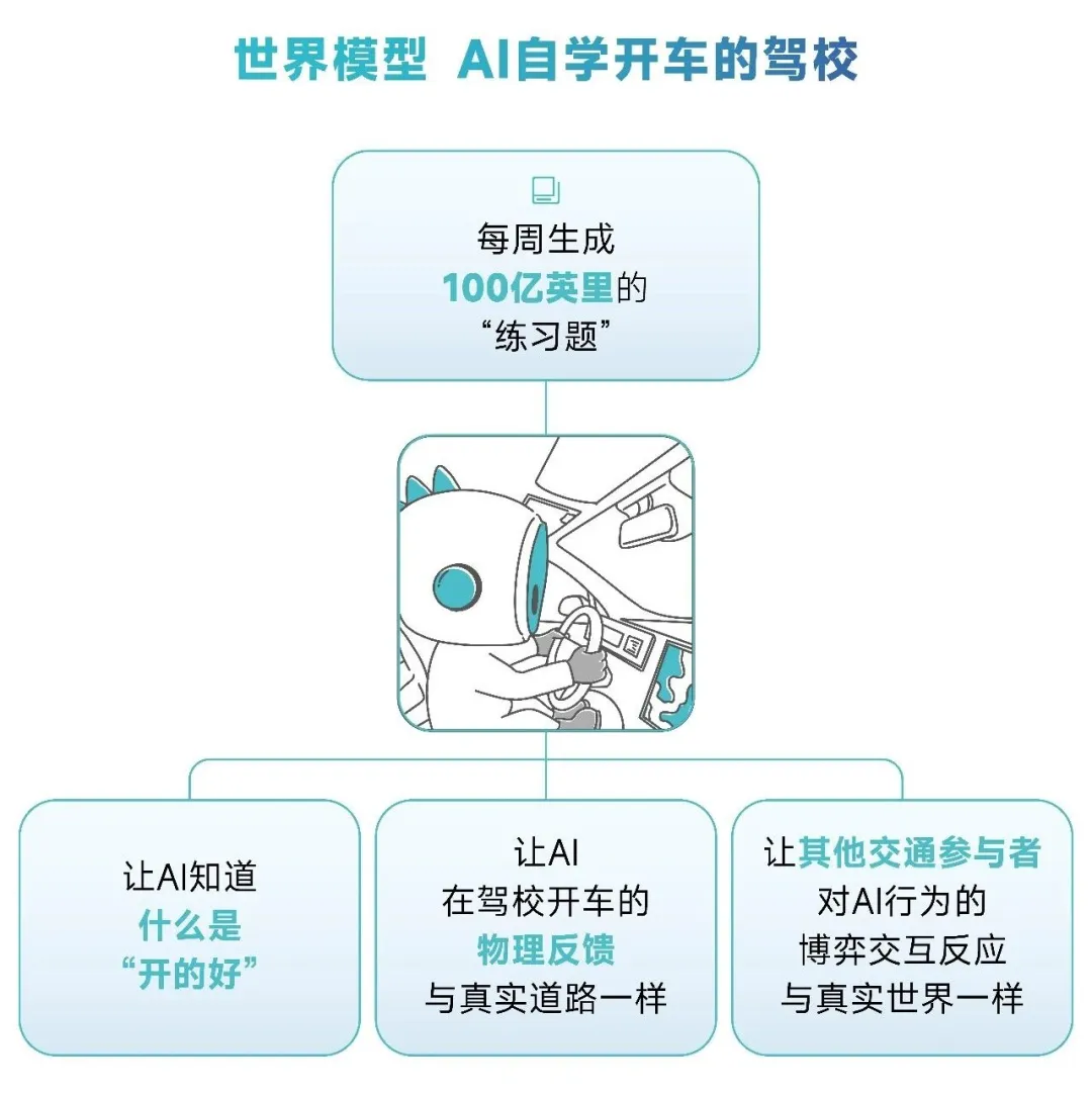 人会如何对特定能力的AI司机做出反应?这个行为并不能凭空遐想,只有让AI司机上路才知道。因此世界模型精度的提升与对齐,最核心的是需要AI司机实际路测——收集的并不是普通的人类驾驶数据,而是AI司机的驾驶数据。当AI的能力尤其是安全性已经超过人类,那只有AI司机的驾驶数据可以用于提升世界模型了,因为其他交通参与者对AI司机的反应会与对其他人类不同,只通过人类驾驶数据训练的世界模型,永远缺失这块最重要的精度数据。