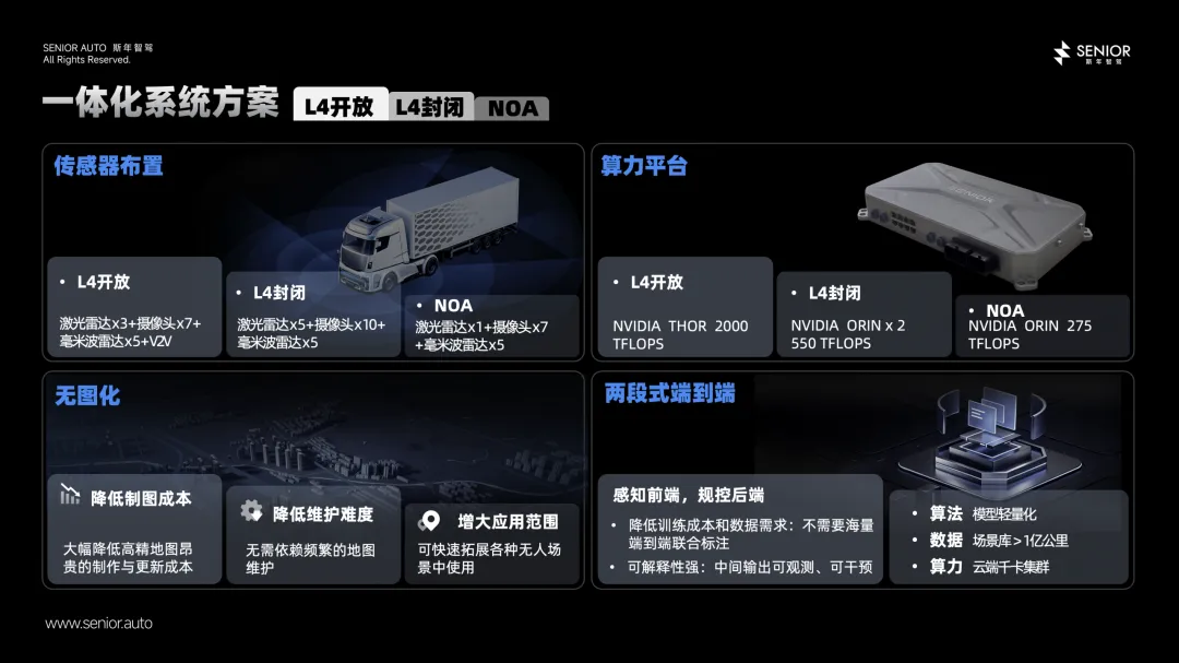 在算法层面,乘用车流行的端到端模型成本极高,需要海量的数据标注、算力资源和训练时间。我们选择了更务实的“两段式端到端”模型,既降低了标注成本和运维复杂度,又可以通过解耦插入更多的安全策略。与此同时,我们更倾向于采用无图或轻图方案,因为高精地图不仅制作麻烦,运维也是难题——道路每天都在变化,地图更新很难跟得上实际路况,现实中就曾发生过无人车因地图未及时更新而掉坑里或堵在路上的情况。所以我们认为,只要具备云端的千卡集群和足够的场景库,通过轻量化模型适配,就能完成两段式端到端模型的训练,同时兼顾开放L4、封闭L4和NOA三种场景。