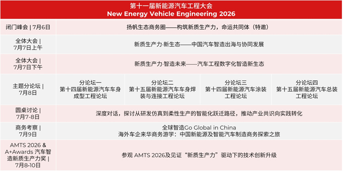 面对变局,NEV Engineering 2026 第十一届新能源汽车工程大会以"新质赋能·破壁共生"为主题,聚焦先进制造、跨界赋能、扬帆出海三大方向,采用"1场全体大会 + 4大细分主题分论坛"架构,并通过「新质生产力共同体」闭门峰会、圆桌讨论、海外车企来华商务游学、精准配对等多元形式,为全球汽车产业链搭建从战略洞察、技术落地到全球拓展的一站式平台。