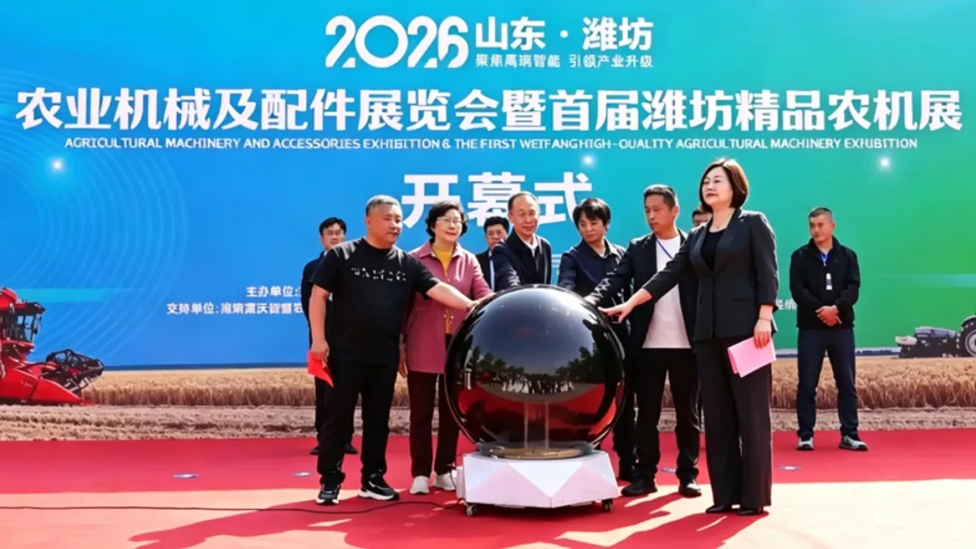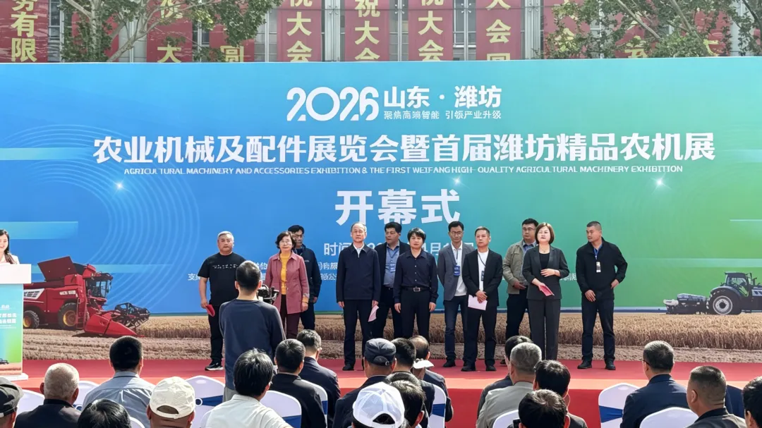 4月18日,2026山东(潍坊)农业机械及配件展览会暨首届潍坊精品农机展,在潍坊金宝国际会展中心火热开幕。