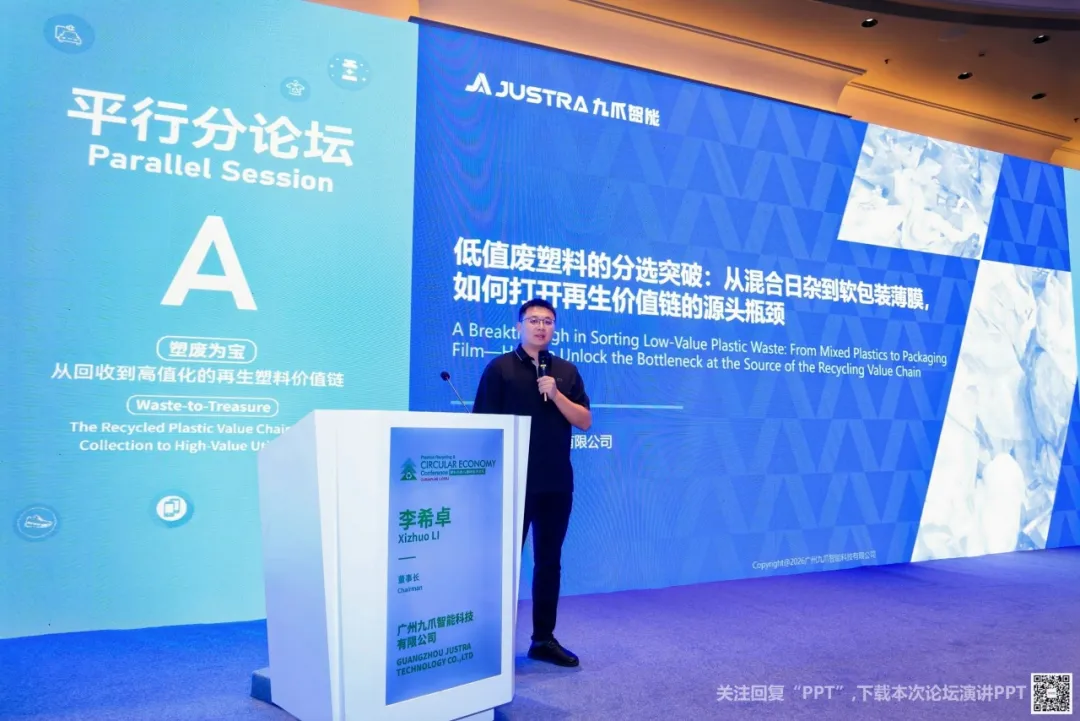 4月20日,上海——第七届CHINAPLAS×CPRJ塑料回收再生与循环经济论坛圆满落幕。作为本届上海国际橡塑展的重要平行活动,九爪智能董事长李希卓受邀出席平行分论坛A“塑废为宝:从回收到高值化的再生塑料价值链”,并发表题为《低值废塑料的分选突破:从混合日杂到软包装薄膜,如何打开再生价值链的源头瓶颈》的主题演讲,系统分享了九爪智能在低值废塑料分选领域的技术路径与产业化实践。