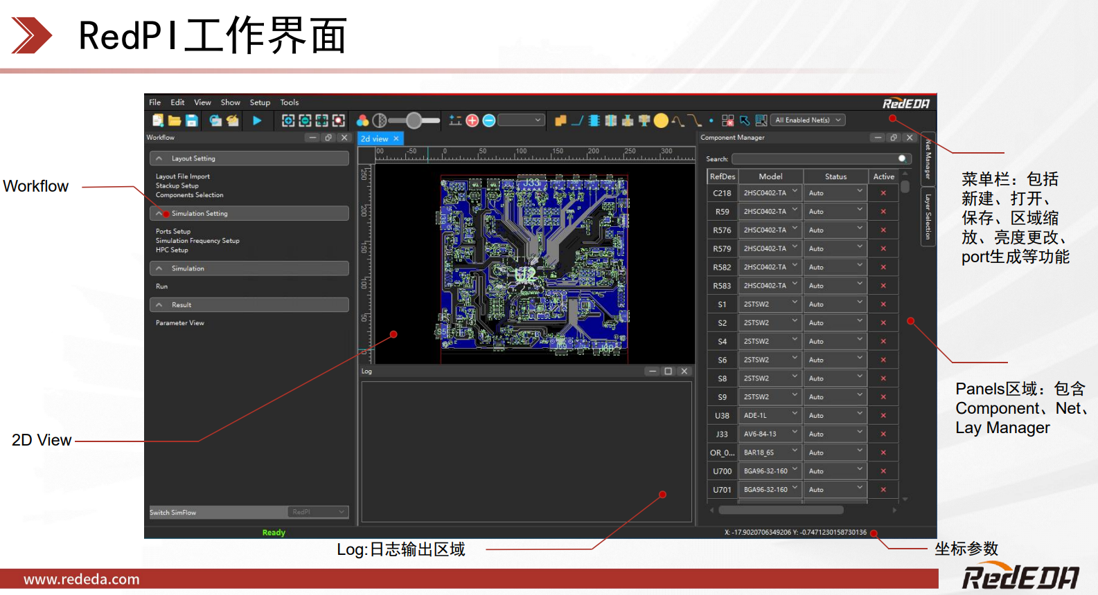 产品介绍:RedEDA 平台包含设计、仿真、生产及测试等环节,核心覆盖电源完整性(PI)等仿真能力,适配芯片封装、高密度电路等场景,支持多操作系统与多种文件格式,可与主流设计工具协同使用。