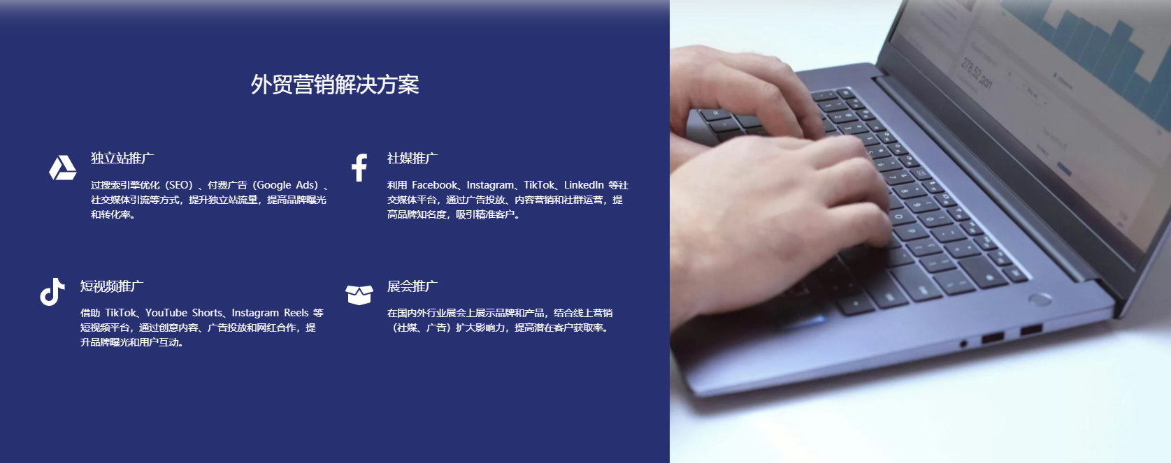 社交媒体营销、短视频矩阵号、独立站+搜索引擎推广、海外展会推广等;