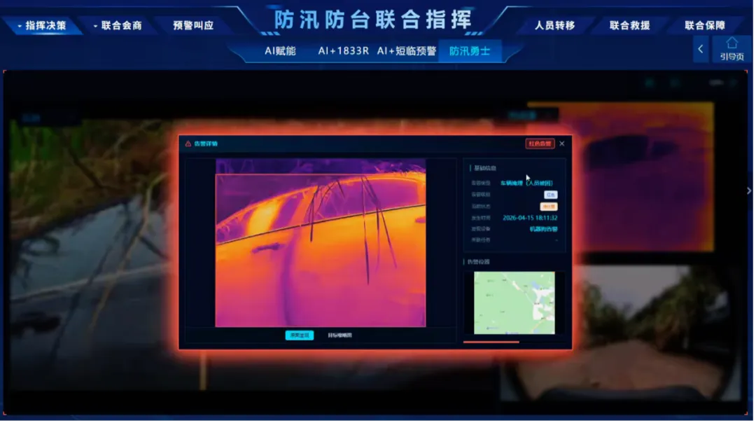 汛期隐患种类多、风险差异大,容易延误最佳救援时机。针对分级预警与快速处置需求,“AI防汛勇士”机器狗建立了分级预警机制,形成规范高效的应急响应流程:识别到边坡落石、路基塌陷、树木倾倒等一般隐患时,系统自动判定为橙色预警,实时上传平台并标注隐患类型与位置;当发现车辆受困、人员被困等重大险情时,系统自动升级为红色预警,同步启动热成像生命探测,指挥中心依据预警等级快速调度最近救援力量到场处置,真正做到早发现、早预警、快响应、快处置。